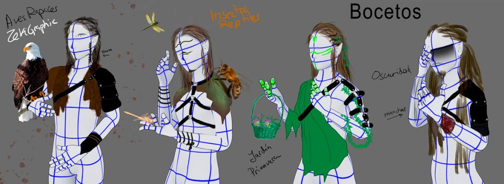 La estética de estos personajes tenían que ser de guerreros de la naturaleza, con la peculiaridad de que tenian que tener todos el pelo largo, cada uno se iba a encargar de la protección de un campo, tierra, agua, viento, animales…