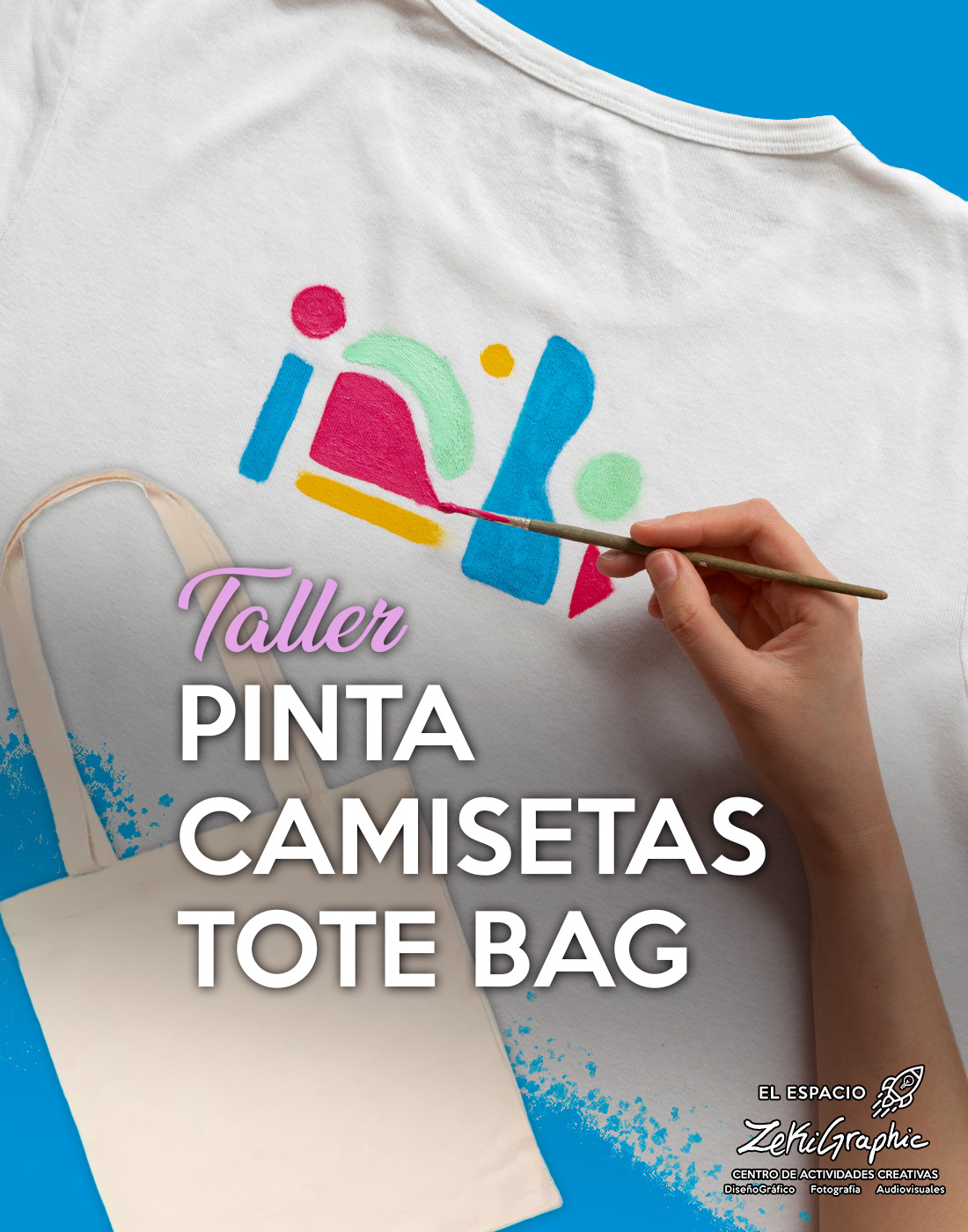 - Material incluido: Todo lo necesario para el taller será proporcionado, incluyendo camisetas o tote bags, pinturas textiles, pinceles y plantillas.